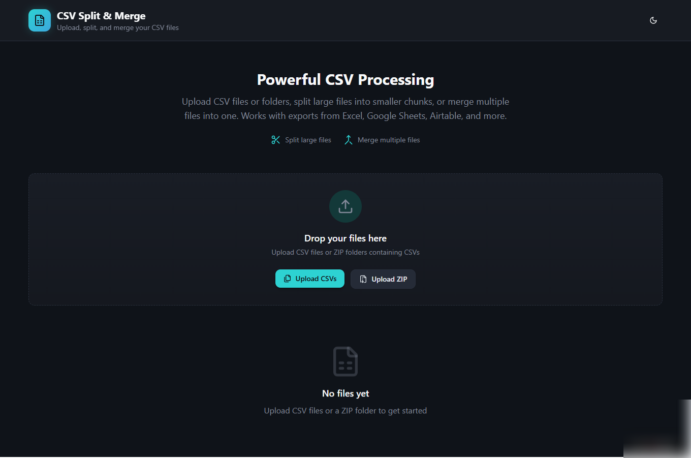 Upload CSV files or folders, split large files into smaller chunks, or merge multiple files into one.